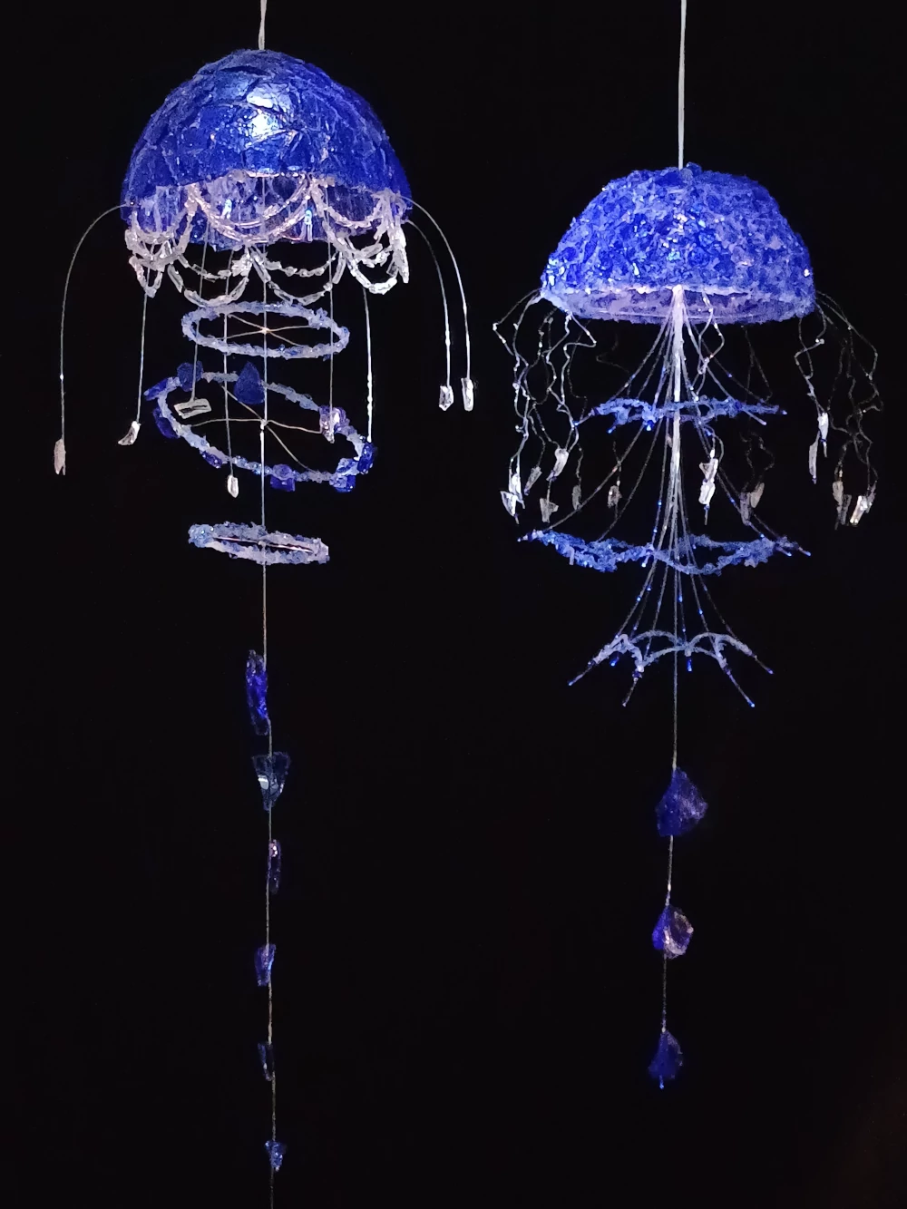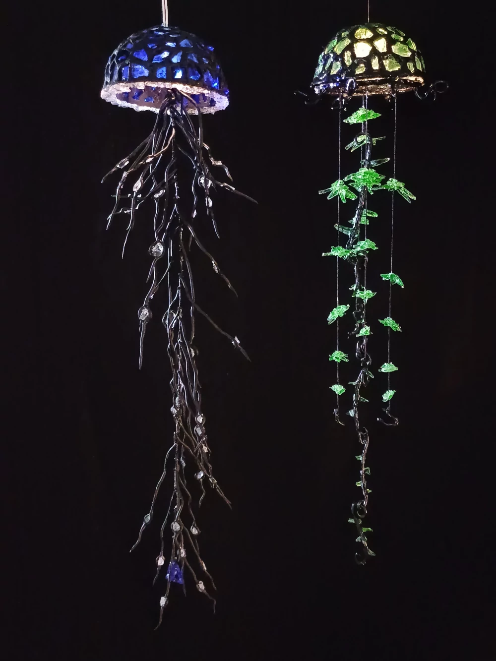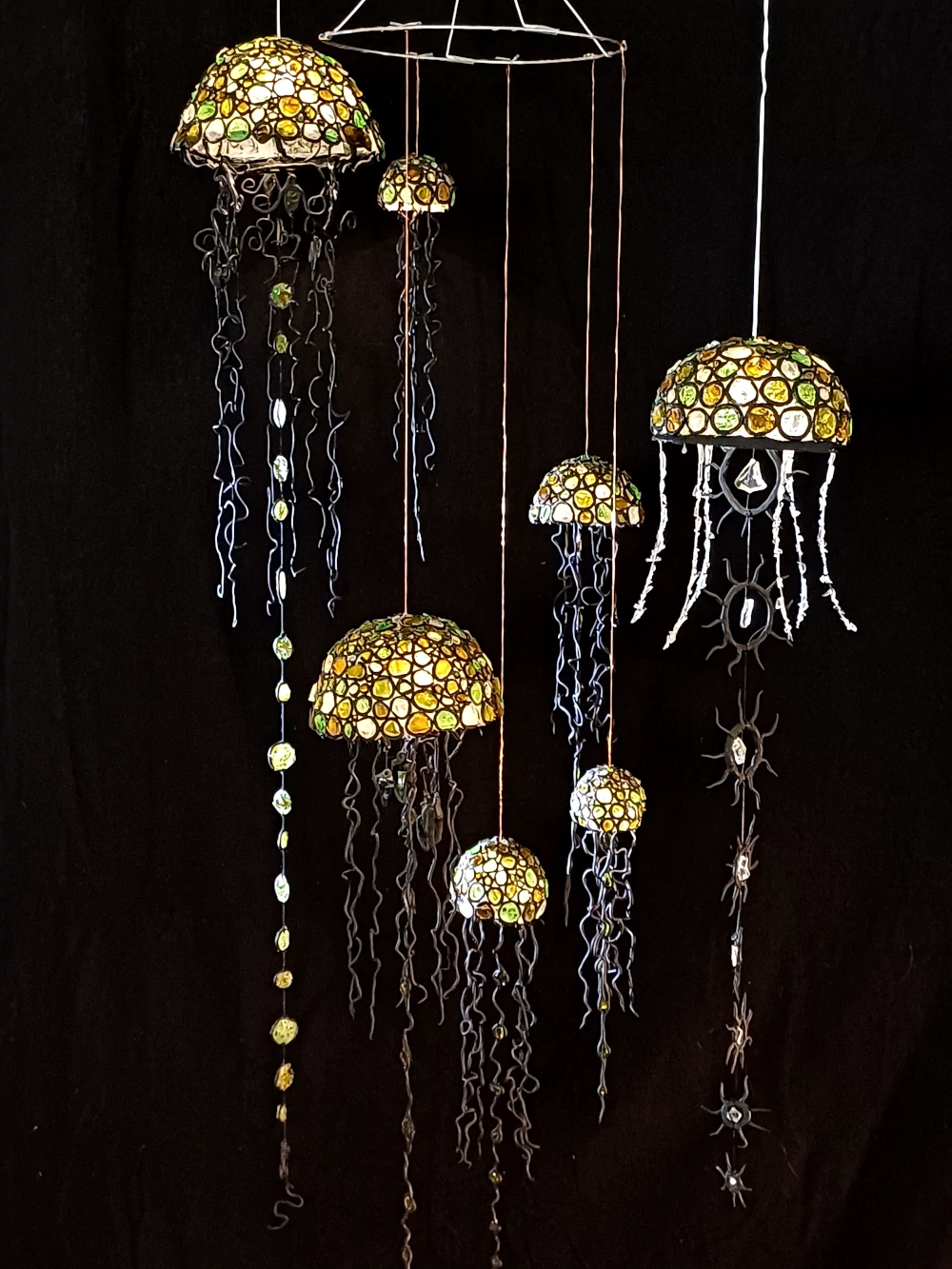 Sie bestehen aus unterschiedlichen, vorwiegend recyclierten Materialien wie Glas, Papier, Stoff, Fäden ... treten einzeln oder in Mobiles gefertigten Schwärmen von 3 -5 Stück auf.