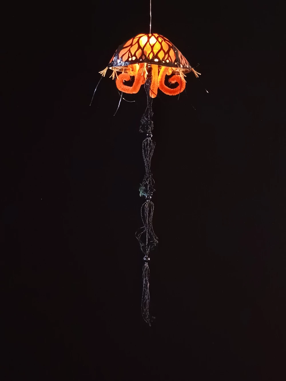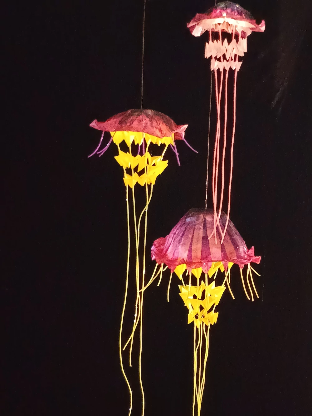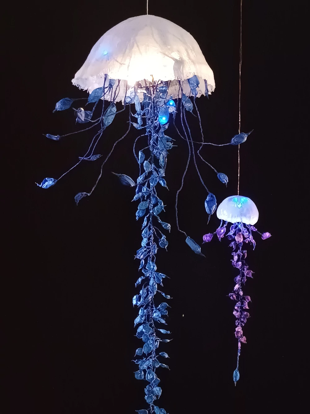 Sie bestehen aus unterschiedlichen, vorwiegend recyclierten Materialien wie Glas, Papier, Stoff, Fäden ... treten einzeln oder in Mobiles gefertigten Schwärmen von 3 -5 Stück auf.